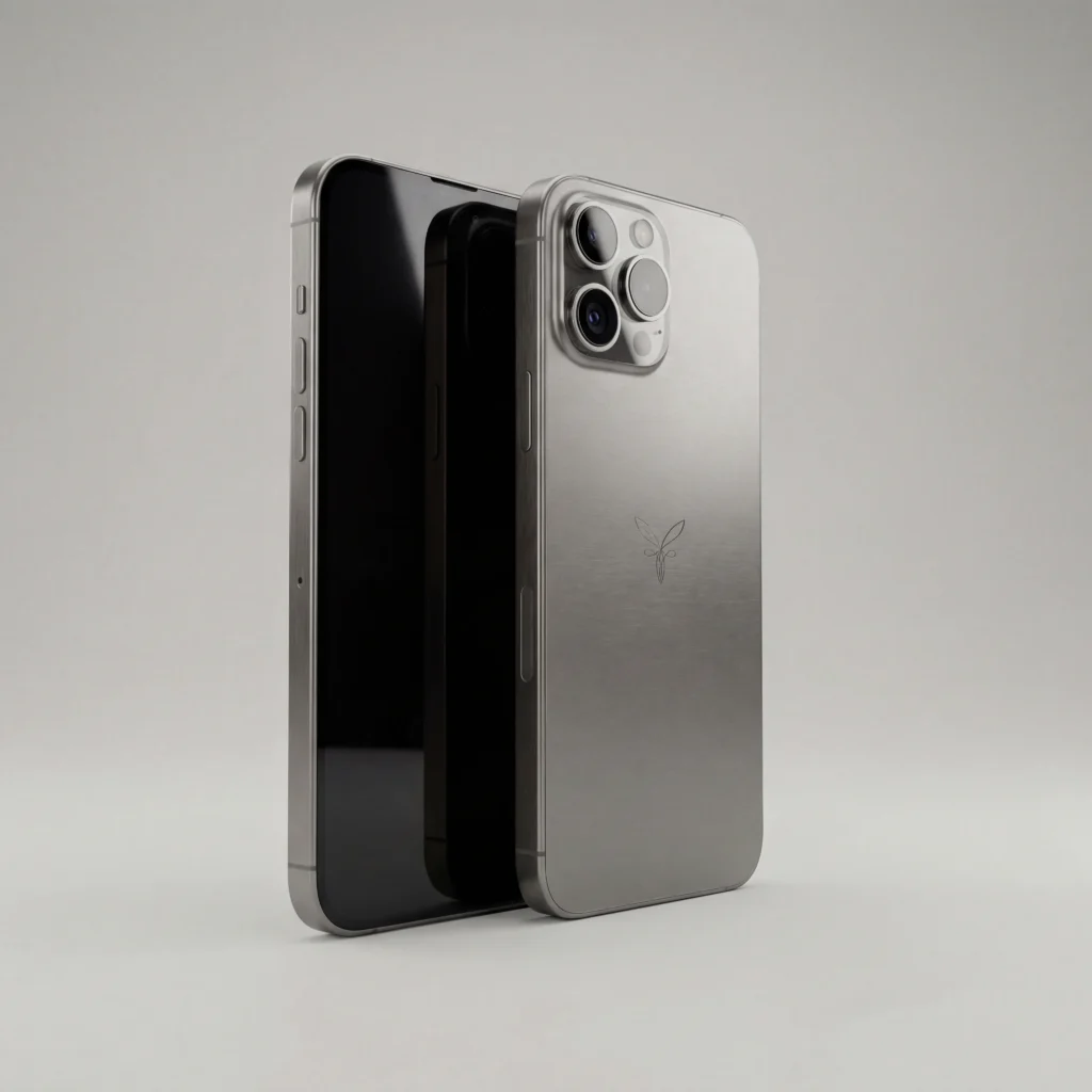 Ultrarealistyczna fotografia produktowa nowoczesnego smartfona z najwyższej półki. Telefon stoi pionowo pod lekkim kątem na gładkiej, jasnoszarej, matowej powierzchni. Ekran jest wyłączony, czarny i lustrzany, z perfekcyjnym odbiciem studyjnego softboxu. Obudowa z matowego tytanu w kolorze kosmicznej szarości. Wyraźne detale trzech obiektywów aparatu z tyłu, metalowe pierścienie wokół soczewek, delikatne grawerowanie logo. Oświetlenie krawędziowe (rim lighting) oddziela telefon od tła. Wysoka rozdzielczość 8k, detale tekstury metalu i szkła, renderowanie z włączonym ray tracingiem.