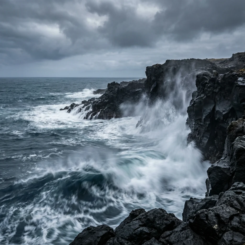 Styl National Geographic, wysoka rozdzielczość, ostre skupienie, brak szumu.Fotorealistyczny obraz dzikiego, skalistego wybrzeża Islandii. Potężne, ciemnoniebieskie fale Atlantyku rozbijają się o czarne bazaltowe klify, tworząc białą pianę. Fotografia realistyczna HD, oświetlenie nastrojowe, pochmurny, dramatyczny dzień. Drobne kropelki wody w powietrzu, długa ekspozycja pokazująca ruch wody, niesamowita tekstura skał. 8k, ostre jak brzytwa, fotorealizm.