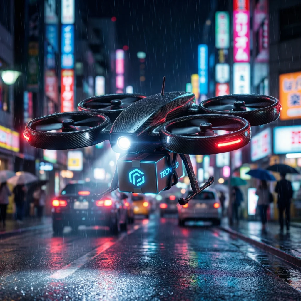 Fotorealistyczne ujęcie zaawansowanego, autonomicznego drona dostawczego unoszącego się w powietrzu nad mokrą ulicą futurystycznego miasta nocą. Dron ma smukłą, czarną obudowę z włókna węglowego i cztery rotory osłonięte pierścieniami. Z przodu drona świeci jasny, biały reflektor LED, a z boku pulsują czerwone światła pozycyjne. Dron trzyma w chwytaku paczkę z logo technologicznej firmy. W tle widać rozmyte neony, deszcz i ruch uliczny (bokeh). 8k, dynamiczna kompozycja, fotografia reklamowa, kinowe oświetlenie, wysoki kontrast, niesamowita tekstura mokrego metalu i włókna węglowego.