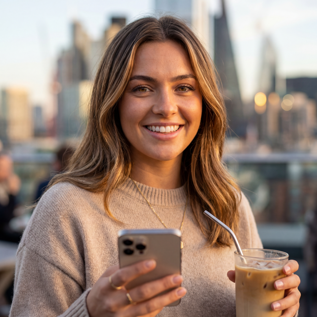 Ultrarealistyczny, fotorealistyczny portret pewnej siebie młodej kobiety, influencerki po dwudziestce. Ustawiona w modnej kawiarni na dachu w Londynie, podczas ciepłego, naturalnego oświetlenia “złotej godziny”, rzucającego na nią miękki blask. Ma szczery, czarujący uśmiech, patrzy prosto w kamerę wciągającymi, orzechowymi oczami. Jej ułożone brązowe włosy z subtelnymi karmelowymi pasemkami są lekko rozwiane przez wiatr. Ubrana jest w wysokiej jakości, beżowy sweter z kaszmiru i delikatny złoty naszyjnik. W jednej ręce trzyma smukły, luksusowy smartfon przygotowany do selfie, a w drugiej mrożoną latte z metalową słomką. Zrobione na Canonie EOS R5, obiektyw 85mm f/1.4, mała głębia ostrości, piękny bokeh w tle z rozmytymi budynkami miasta. Widoczne tekstury skóry, pojedyncze pory, naturalne niedoskonałości i blaski w oczach. Ultra-szczegółowy, rozdzielczość 8k, kinowe oświetlenie, czas naświetlania 1/1600s, jakość profesjonalnego portretu do magazynu.