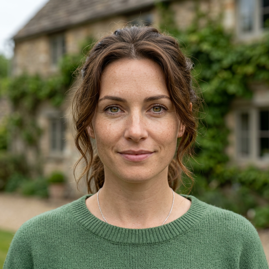 Ultrarealistyczny portret z bliska naturalnie pięknej kobiety w wieku około 30 lat. Kobieta ma falowane, kasztanowe włosy luźno upięte z tyłu, wyraziste piwno-zielone oczy i delikatne piegi na twarzy. Ubrana jest w wygodny, zielony sweter z dzianiny i delikatny srebrny łańcuszek. Łagodny, pewny siebie uśmiech, patrzy prosto w obiektyw. Tło to gładko rozmyta (efekt bokeh) scena plenerowa przedstawiająca rustykalny kamienny dom porośnięty pnącym się zielonym bluszczem. Miękkie, naturalne światło dzienne, oświetlenie kinowe. Zdjęcie zrobione obiektywem portretowym 85 mm, przysłona f/1.8, rozdzielczość 8k, niesamowicie szczegółowe, fotorealizm