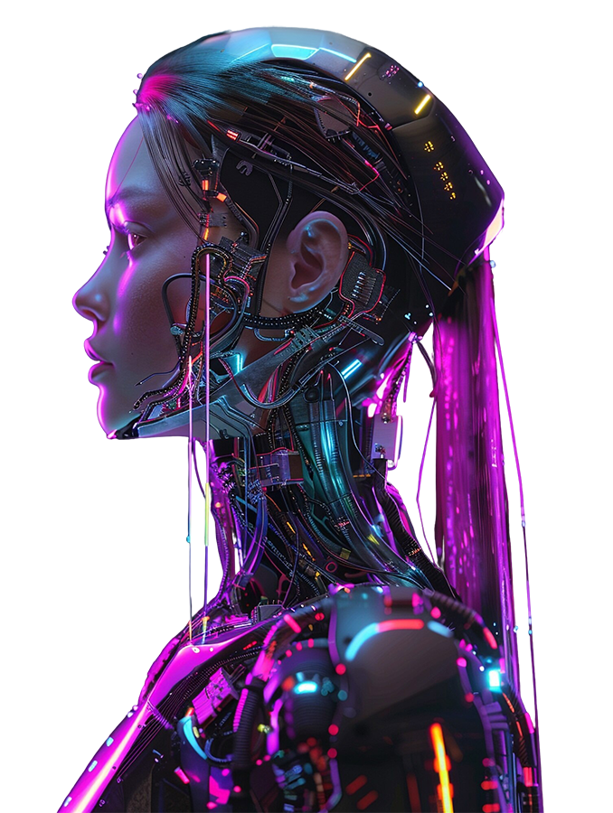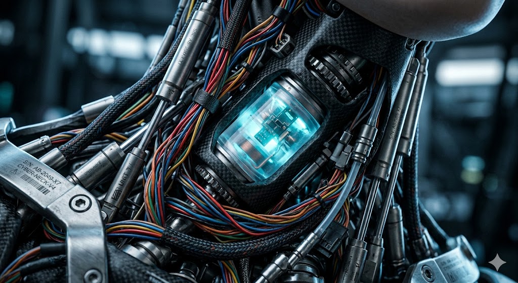 Prompt: Ekstremalne zbliżenie makro na odsłonięty mechanizm szyi biomechanicznego androida. Widoczna skomplikowana plątanina cienkich, kolorowych przewodów (czerwonych, niebieskich, żółtych) splecionych z hydraulicznymi tłokami wykonanymi ze szczotkowanego tytanu. Centralnym punktem jest półprzezroczysty rdzeń energetyczny pulsujący miękkim, błękitnym światłem, otoczony elementami z włókna węglowego. Na metalowych częściach widać mikroskopijne numery seryjne i delikatne smary. Oświetlenie zimne, laboratoryjne, z wyraźnym oświetleniem krawędziowym (rim lighting). Wysoka rozdzielczość 8k, fotorealizm, niesamowita głębia ostrości, styl “Ghost in the Shell”.